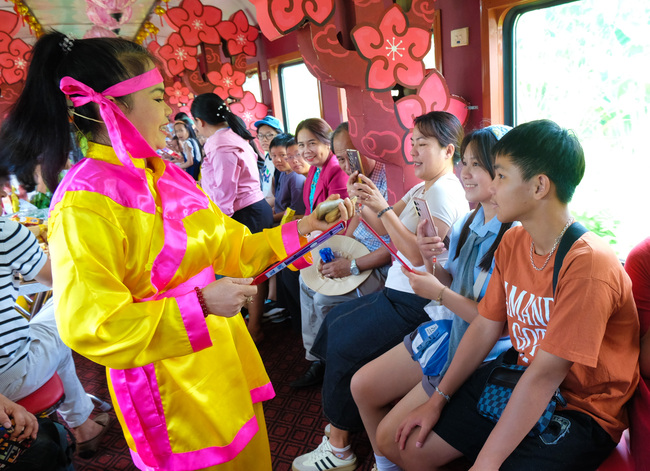 Hòa cùng không khí vui nhộn của Hội đánh bài chòi dân gian trên tàu hỏa du lịch. Ảnh: Đoan Ngọc