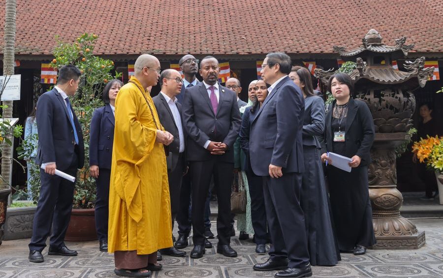 Prime Minister Pham Minh Chinh (R) and his Ethiopian counterpart Abiy Ahmed Ali (center) at Tran Quoc Pagoda, April 17, 2025. Photo: FB Thong tin Chinh phu