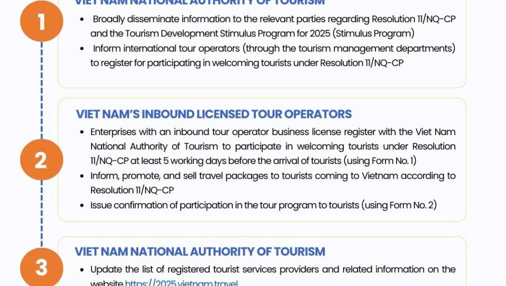The visa exemption policy with a temporary residence period of 45 days from the date of entry for tourism purposes for citizens of the Republic of Poland, the Czech Republic and the Swiss Confederation under Resolution No. 11/NQ-CP is implemented from 1 March 2025 to 31 December 2025 to stimulate tourism development. Citizens of the 3 countries entering Vietnam need to meet: entry conditions under the unilateral visa exemption according to the Law on entry, exit, transit, and residence of foreigners in Vietnam, and passports with a validity of at least 6 months. They are required to travel on tours organized by Vietnam’s inbound licensed tour operators and show a confirmation of participation in the tour program issued by the Vietnam’s tour operators (according to Form No. 2). Vietnam’s tour operators need to send registration of organizing tour programs for citizens of the 3 countries to the Vietnam National Authority of Tourism (according to Form No. 1).